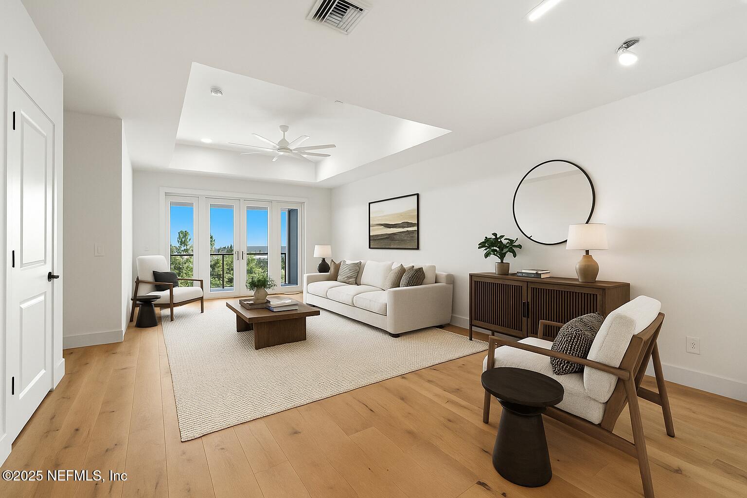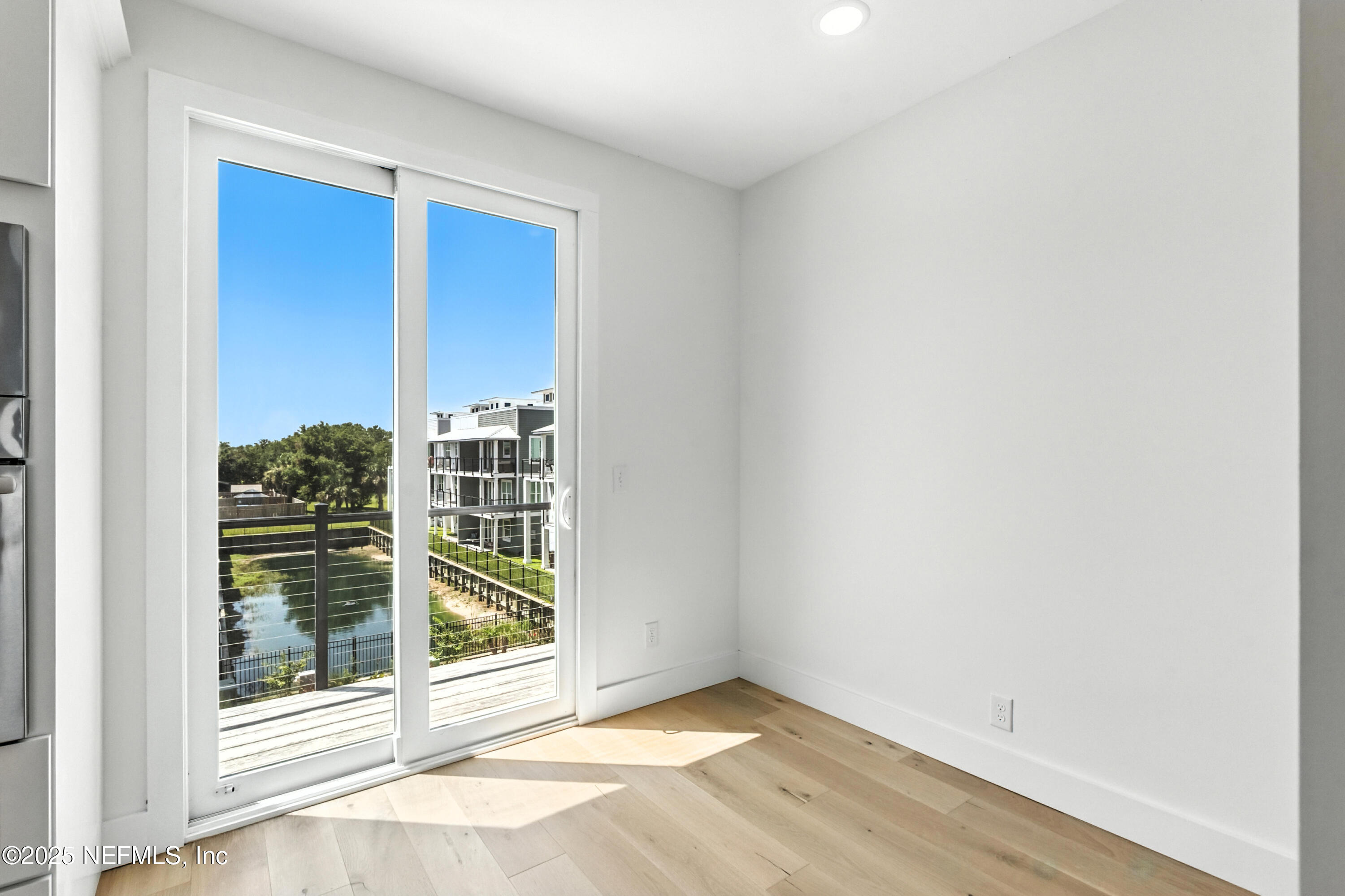 The third floor showcases a bright, fully open floor plan thoughtfully designed for effortless entertaining and everyday living. The gourmet kitchen features a waterfall-edge quartz island with generous storage, high-end stainless steel appliances, an electric range, and designer cabinetry. A casual dining nook off the kitchen opens to a private balcony with expansive views of the Intracoastal Waterway, heated pool, and the surrounding community. The open dining area flows seamlessly into the spacious living room, which extends onto a second covered balcony overlooking the marina and Intracoastal. From the front windows, enjoy an incredible view of the historic St. Augustine Lighthouse.